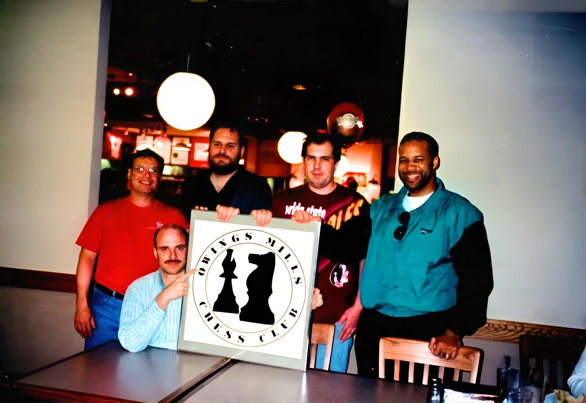Members of the Owings Mills Chess Club, circa spring 1997. Standing from left: John Dotson, Chris Gobrecht, Mike Gilbert, Dr. Vincent Pearson. Seated: Noel Flater. Not Pictured: Marshall Roane.